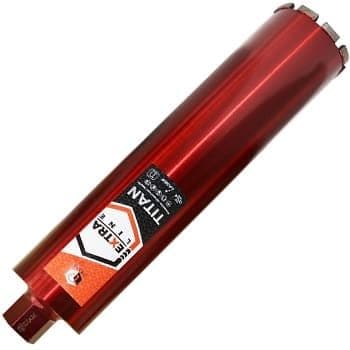 Алмазная коронка DIAM Extra Line ТITAN Ø112 мм изготовлена по уникальной технологии, при которой алмаз покрывается специальной титановой оболочкой, обеспечивая дополнительную защиту алмаза при высоких температурах и повышенных нагрузках. Применяется для сверления бетона и высокоармированного железобетона. Количество сегментов - 10 шт. Средний ресурс алмазной коронки при правильной эксплуатации составляет 12-14 м.п. Длина коронки 450 мм. Применяются совместно с установками алмазного бурения с хвостовиком 1¼.