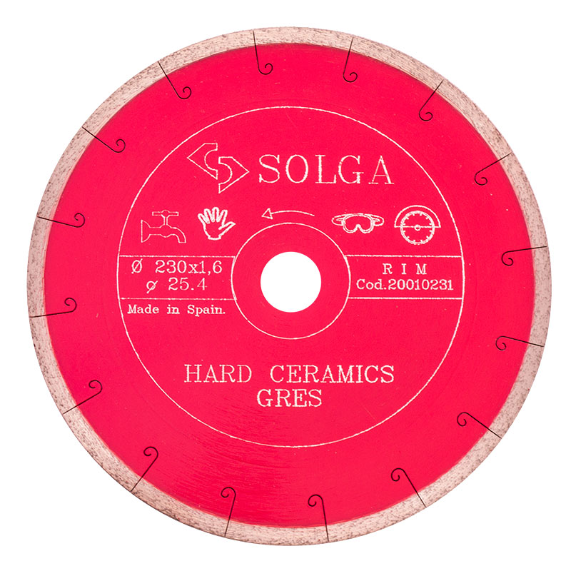 Алмазный диск Solga Diamant HARD CERAMICS Ø230 мм предназначен специально для резки керамики и керамогранита. Толщина алмазного слоя 10 мм, а толщина 1,8 мм. Посадочное отверстие - 25,4 мм. Сплошная режущая кромка обеспечивает точный и гладкий рез без сколов. Резка осуществляется с применением водяного охлаждения. Диск используется на плиткорезных станках.