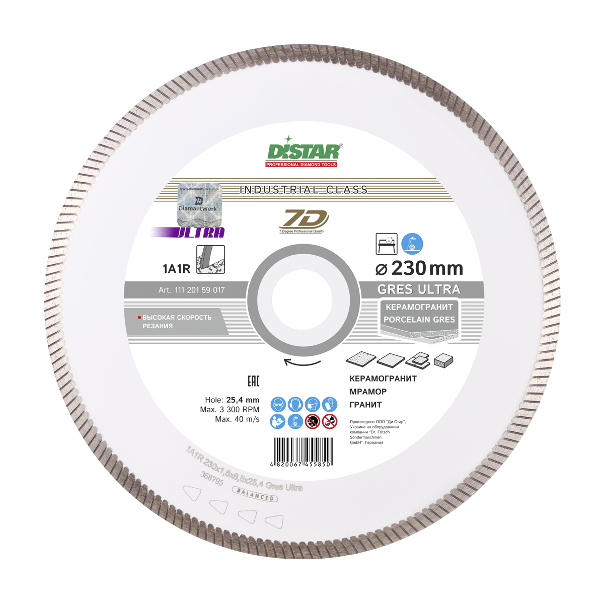 Алмазный диск Distar 1A1R Gres Ultra Ø230 мм с высокой скоростью реза применяется для резки керамогранита, керамической напольной плитки и мрамора с водяным охлаждением. Толщина алмазного слоя 1,6 мм, а высота 8,5 мм. Посадочное отверстие - 25,4 мм. Диск используется на угловых шлифовальных машинах и камнерезных станках.
