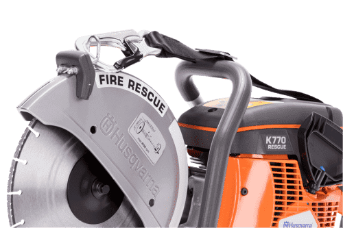 Бензорез Husqvarna K770 Rescue оборудован бензиновым двигателем мощностью 5 л.с. Применяется во время спасательных работ и расчистки завалов для резки армированного бетона, каменной кладки и металлоконструкций. Входит в стандартное оснащение пожарных и спасательных бригад. Максимальная глубина реза составляет 100 мм. Используемый диаметр диска 300 мм. Магниевый кожух разработан таким образом, чтобы его можно было увидеть в дыму и брызгах воды, а цифровая система зажигания обеспечивает надежный и быстрый запуск в любой аварийной ситуации. Бензорез оснащен ремнем для переноски, специальными рукоятками для работы в толстых перчатках и укороченным хромированным кожухом, который позволяет выполнять резку под разными углами к разрезаемому материалу. Повышенная износостойкость благодаря полностью герметичной ременной трансмиссии, что не позволяет попадать шламу внутрь машины. Вес оборудования 10 кг.