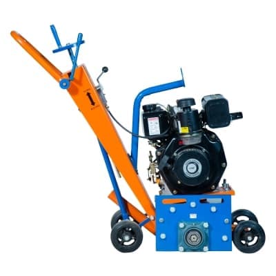 - Подъем машины осуществляется за серьгу, расположенную на защитной дуге. Задние транспортные колеса оснащается роликовым подшипником и пресс-масленкой, которая обеспечивает своевременное смазывание. Контактный слой большегрузного колеса выполнен из эластичной качественной резины. Диаметр колеса: 160 мм. Нагрузка на одно колесо: 250 кг. Расстояние между передними колесами 250 мм, что дает возможность демаркировки дорожной разметки