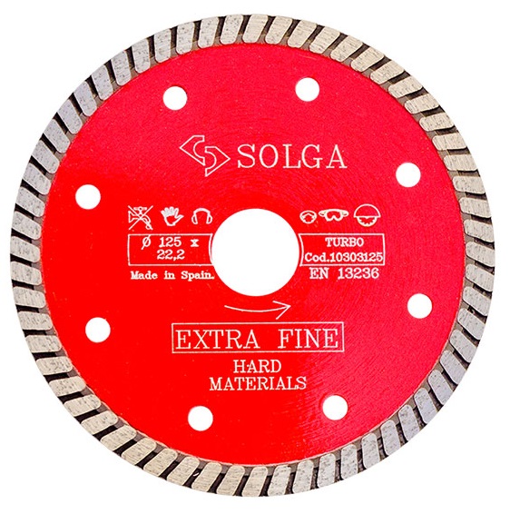 Алмазный диск Solga Diamant HARD MATERIALS Ø125 мм используется для резки керамики, гранита и керамогранита. Толщина алмазного слоя 10 мм, а толщина 1,8 мм. Посадочное отверстие - 22,23 мм. Сплошная турбо кромка увеличивает скорость при работе с твердыми материалами и обеспечивает чистоту реза.
