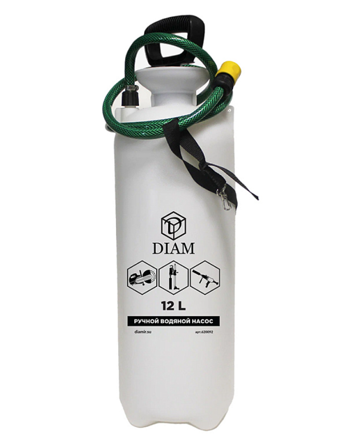 Ручной водяной насос DIAM 12 л/3 м изготовлен из ударопрочного пластика. Применяется со сверлильными машинами и бензиновыми резчиками для подачи воды в зону сверления/реза. Объем насоса 12 л, длина шланга - 3 м. Подача воды осуществляется ручной помпой. Вес оборудования 2,6 кг.