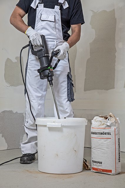 Строительный миксер Eibenstock EHR 15.2 SB SET мощностью 1050 Вт применяется для смешивания строительных материалов с низкой вязкостью: клея, краски, цемента и смесей для выравнивания. Максимальный объем смеси - 40 кг. Шпиндельное соединение - М14. Большие рукоятки и Т-образное смешивание обеспечивают простую и удобную эксплуатацию. Вес оборудования 3,1 кг.