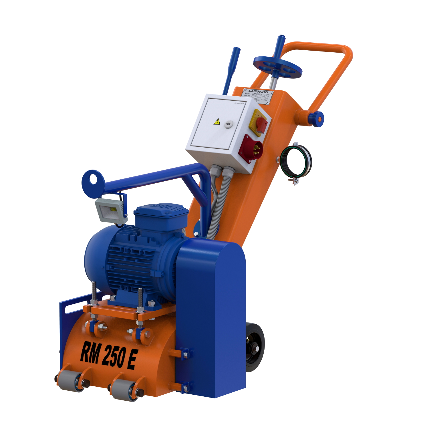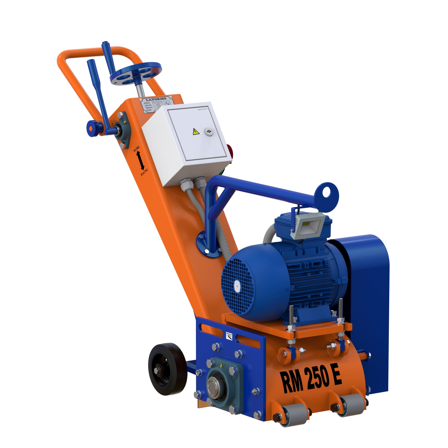 Фрезеровальная машина LATOKHO RM 250 E оснащена электрическим двигателем мощностью 5,5 кВт. Рабочая ширина обработки составляет 250 мм, а вес машины 150 кг. Максимальная глубина фрезерования - 8 мм. Используется для фрезерования бетона до марки B40 и асфальта, удаления краски с бетона, очистки покрытий, придания шероховатости поверхности и удаления дорожной и пластиковой разметки с асфальта. На машине предусмотрен выход на пылесос диаметром 40 мм. Машина оборудована съемной боковой панелью, которая меняется в течение 10 минут, при этом машина находится в вертикальном положении. Данные показатели являются самыми быстрыми в мире на этом классе машин. Подъем машины осуществляется за серьгу, расположенную на защитной дуге. Задние транспортные колеса оснащается роликовым подшипником и пресс-масленкой, которая обеспечивает своевременное смазывание.