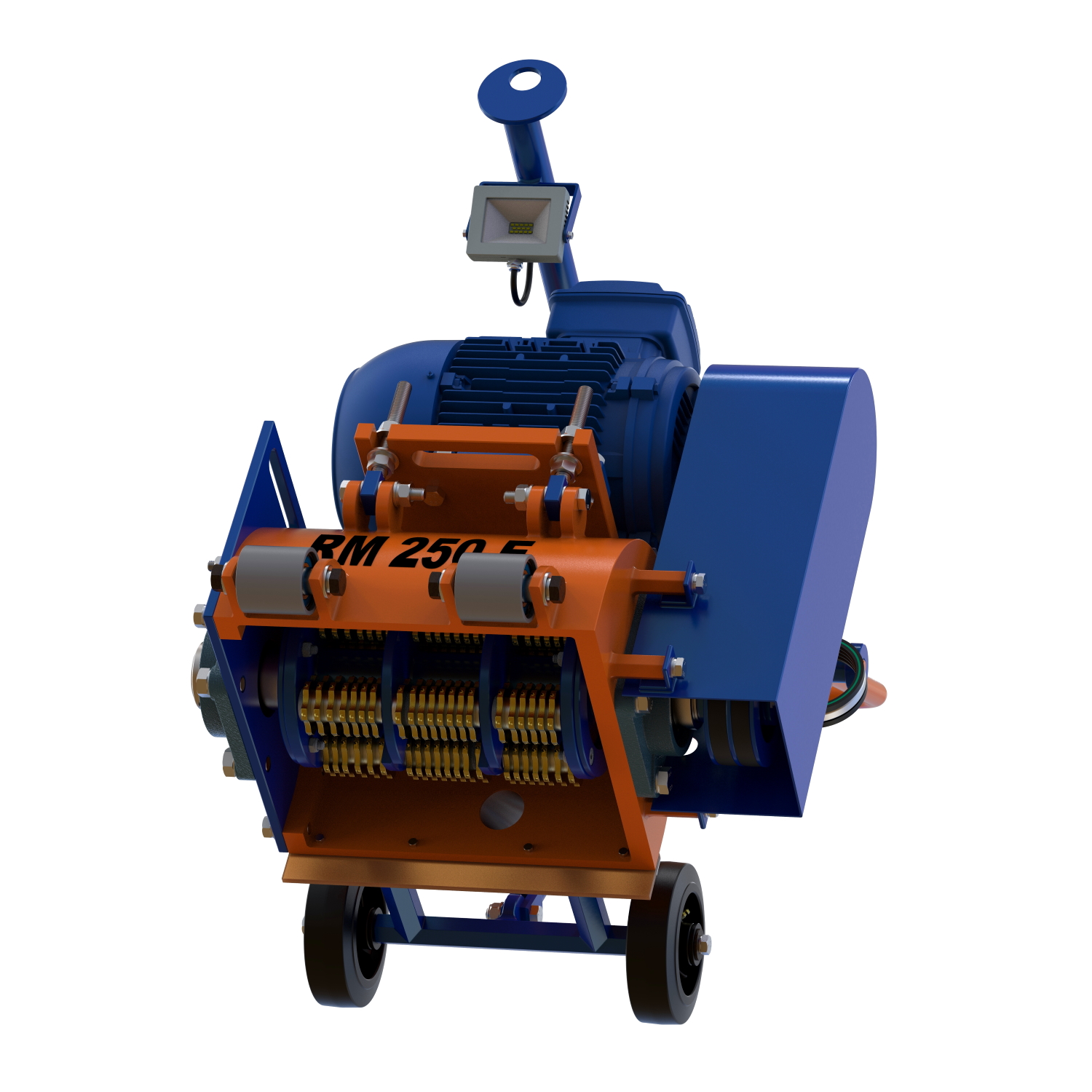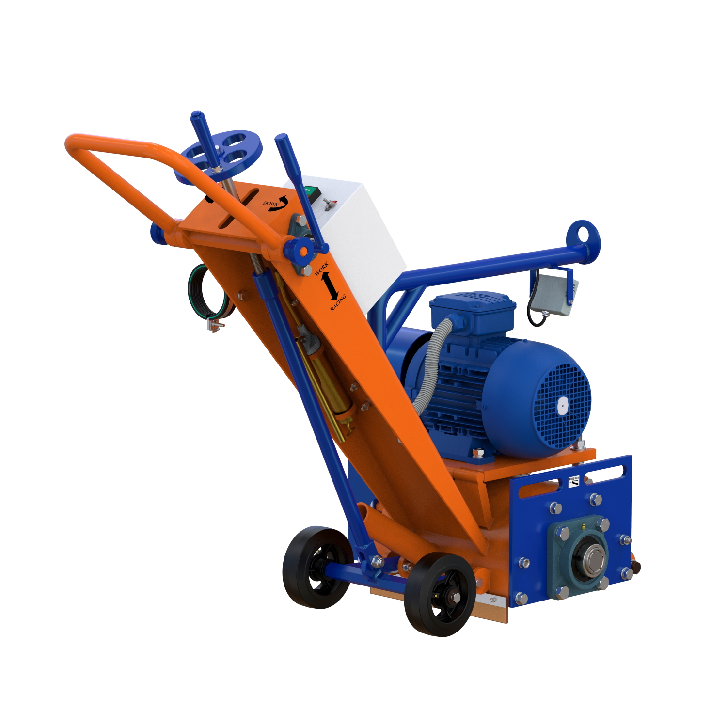 - Подъем машины осуществляется за серьгу, расположенную на защитной дуге. Задние транспортные колеса оснащается роликовым подшипником и пресс-масленкой, которая обеспечивает своевременное смазывание. Спереди расположены два металлических опорных ролика, что дает возможность фрезерования стыков