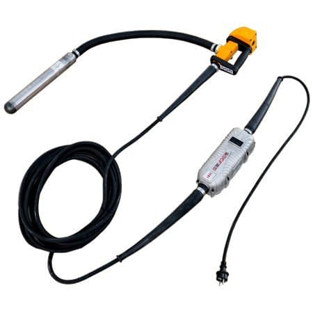 Глубинный вибратор SPYDER PRO 50 Gun со встроенным преобразователем применяется для уплотнения бетонных смесей. Мощность двигателя 1,1 кВт. Диаметр булавы 50 мм, а длина 365 мм. Вибратор оснащен эргономичной рукоятью в виде пистолета и коротким гибким валом длиной 0,8 м. Корпус вибратора выполнен из алюминия. Кнопка управления изолирована, что позволяет избежать проникновения жидкости внутрь. Если оборудование фиксирует, что сила тока превышает средние показатели, оно автоматически отключается. Вибратор оснащен фильтром против электромагнитных интерференций сети. Вес оборудования 14 кг.