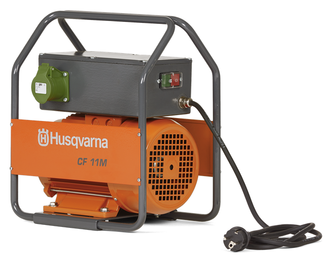 Высокочастотный преобразователь Husqvarna CF 11M способен питать от одного до четырех высокочастотных вибраторов серии AX или VB. Преобразователь обеспечивает ток напряжением 42 В с частотой 200 Гц и стабильную мощность. Надежная конструкция защищает устройство от брызг бетона и повреждений, обеспечивая длительный срок службы. В случае просадки напряжения преобразователь не перезапускается до тех пор, пока не будет нажата кнопка сброса. Вес оборудования 18 кг.