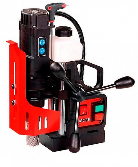 Магнитный сверлильный станок Promotech МС-36 мощностью 1,05 кВт применяется для сверления отверстий корончатыми сверлами диаметром до 40 мм. Компактные габариты станка позволяют работать в узких, труднодоступных местах. Прижимная сила магнита 9500 H. Частота вращения шпинделя 350 об/мин. Трубчатые направляющие обладают высокой износостойкостью. Встроенная система автоматической подачи смазочно-охлаждающей жидкости облегчает работу оператора и продлевает срок службы режущего инструмента. Специальное основание на основе электромагнита позволяет крепить станок к сверлимой заготовке, а система MFSC предотвращает случайный отрыв основания в процессе работы. Вес оборудования всего 10 кг.
