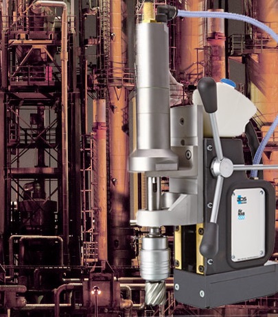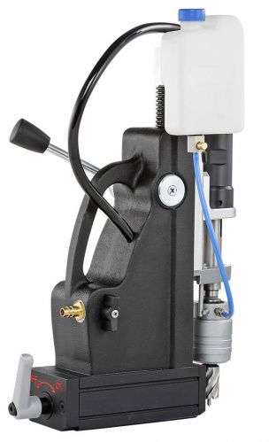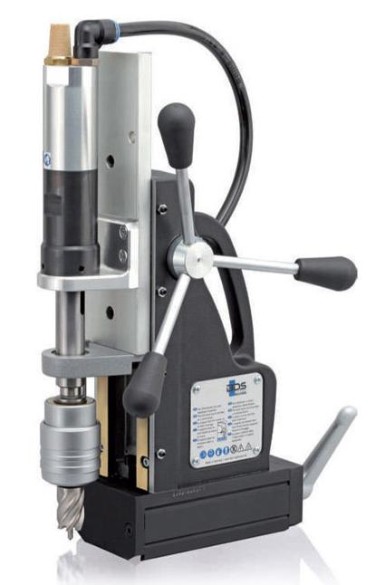 Магнитный сверлильный станок BDS AirMAB 5000 с пневмоприводом мощностью 0,8 кВт применяется для создания отверстий корончатыми и спиральными сверлами. Максимальный диаметр корончатым сверлом 130 мм, а спиральными 45 мм. Рабочий ход 160 мм.Двигатель из нержавеющей стали сертифицирован по классу взрывозащиты Ex II 2G T4 IIC D110° C. Автоматическая система обеспечивает подачу охлаждающей жидкости непосредственно в зону сверления. Вес оборудования 17,5 кг.
