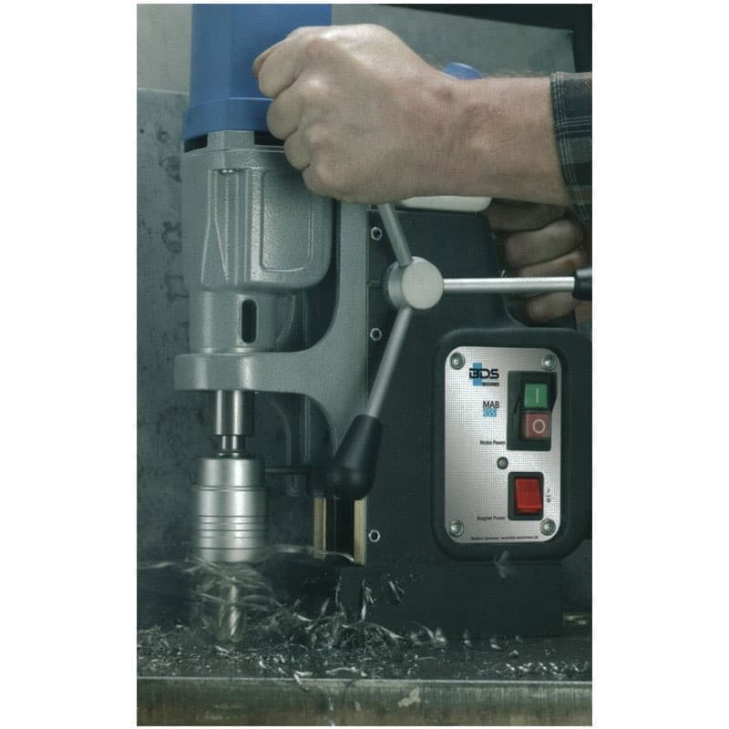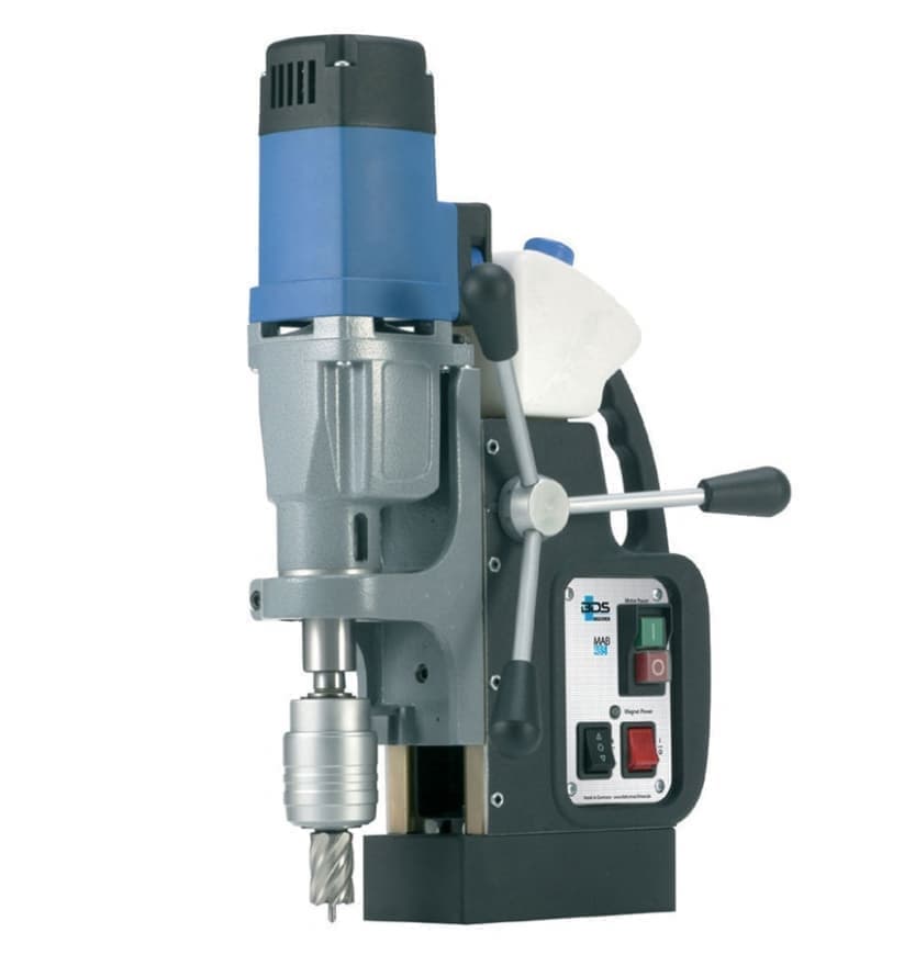 Магнитный сверлильный станок BDS MAB 455 оснащен двухступенчатым редуктором мощностью 1150 Вт, работающим в масляной ванне. Максимальный диаметр сверления корончатым сверлом составляет 40 мм. Используется для сверления стали спиральными и корончатыми сверлами, а также зенкерования. Имеет автоматическую подачу охлаждающей жидкости непосредственно в зону резания. Вес оборудования 13 кг.
