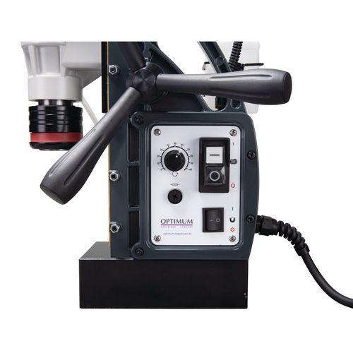 Магнитный сверлильный станок OPTIdrill DM50V оснащен электрическим двигателем мощностью 1,7 кВт, работает от сети 220В. Станок применяется для изготовления металлоконструкций, активно используется в автомобилестроении и машиностроении. Переход от сверления корончатым сверлом к сверлению спиральным сверлом за несколько простых шагов. Максимальный диаметр сверления корончатым сверлом 50 мм, спиральным сверлом - 13 мм. Прижимная сила магнита 15600 Н. Размер магнитного основания 166х80 мм. Ход шпинделя 220 мм. Станок с бесступенчатым регулированием скорости под нагрузкой в оборотах 100 и 810. Износостойкое магнитное основание имеет увеличенный срок службы и увеличенную максимальную удерживающую силу. На станке предусмотрена ручка для удобного подъема и переноски. Вес оборудования 14,8 кг.