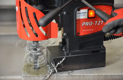Магнитный сверлильный станок Promotech PRO-72T оборудован мощным двигателем 1,6 кВт с 2-ступенчатой коробкой передач 120 и 450 об/мин. Станок применяется для сверления отверстий корончатыми сверлами диаметром до 70 мм и спиральными до 25 мм. Ход шпинделя 190 мм. Прижимная сила магнита 11000 H. На станке возможно изменение направления вращения шпинделя, это позволяет нарезать резьбу до M20. На станке есть встроенная система автоподачи СОЖ. Система светодиодных индикаторов позволяет контролировать состояние машины во время работы, что повышает безопасность и продлевает срок службы станка и дополнительных инструментов. Вес оборудования 18 кг.