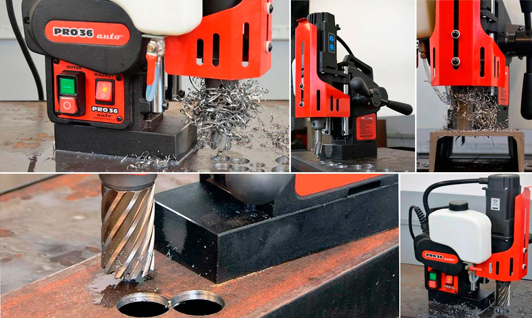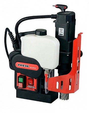 Сверлильно-фрезерный станок Promotech PRO36 AUTO - компактный станок с автоподачей сверла. Соотношение крутящего момента и скорости вращения позволяет с успехом работать как корончатыми сверлами с твердосплавными напайками (ТСТ) так и из быстрорежущей стали HSS. Максимальный диаметр сверления отверстий корончатыми сверлами диаметром до 36 мм, спиральными до 12 мм. Ход шпинделя 70 мм. Частота вращения шпинделя 350 об/мин. Максимальная глубина сверления 51 мм. Новейшее магнитное основание обеспечивает мощное притяжение к поверхности толщиной от 6 мм. Надежные трубчатые направляющие не требуют обслуживания. Вес оборудования 13,5 кг.