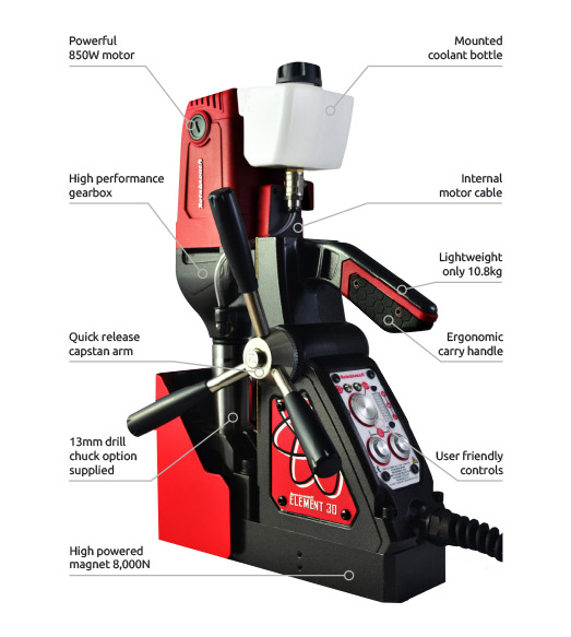 Магнитный сверлильный станок Rotabroach Element 30 предназначен для сверления отверстий глубиной до 32 мм. Магнит используется для удержания сверлильного станка во время сверления, что способствует большей эффективности. Мощность станка 0,85 кВт. Максимальный диаметр сверления корончатым сверлом 32 мм, а спиральным 13 мм. Станок оснащен функцией CutSmart, которая отображает степень нагрузки на сверло. Скорость вращения шпинделя без нагрузки составляет 600 об/мин. Сверлильный станок используется на производстве, в строительстве, на железной дороге, в нефтехимической промышленности и в других сферах, где может потребоваться сверление черных металлов.