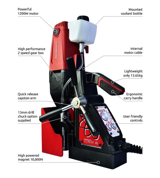 Магнитный сверлильный станок Rotabroach Element 40 мощностью 1,2 кВт предназначен для сверления отверстий глубиной до 35 мм. Магнит используется для удержания сверлильного станка во время сверления, что способствует большей эффективности. Максимальный диаметр сверления корончатым сверлом 40 мм, а спиральным 13 мм. Станок оснащен функцией CutSmart, которая отображает степень нагрузки на сверло. Скорость вращения шпинделя без нагрузки составляет 300-600 об/мин.