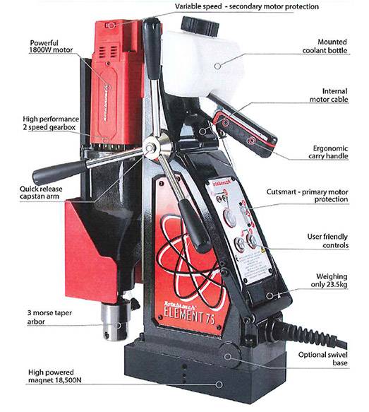 Магнитный сверлильный станок Rotabroach Element 75 мощностью 1800 Вт, используется на производстве, в строительстве, на железной дороге, в нефтехимической промышленности и в других сферах, где необходимо сверление черных металлов глубиной до 75 мм. Максимальный диаметр сверления корончатым сверлом 75 мм, а спиральным 26 мм. Станок оборудован технологией Cutsmart, которая отображает нагрузку на сверло. Автоматическая подача смазочно-охлаждающей жидкости (СОЖ) осуществляется через шпиндель вращения. Станок оснащен удобной ручкой для переноски. Вес оборудования 23,5 кг.