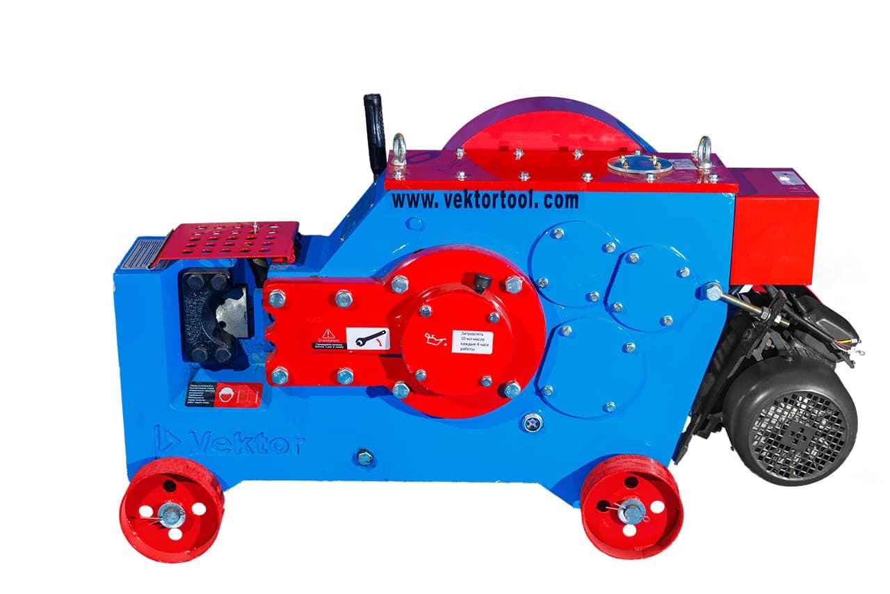 Станок для резки арматуры Vektor GQ40 оборудован электрическим двигателем собственного производства мощностью 3 кВт с классом изоляции F. Станок применяется для высокоточной обработки стальных прутьев арматуры с винтовой нарезкой или без нее. Максимальный диаметр арматурной стали составляет 40 мм. За счёт использования шестерни с косыми зубами, уровень шума в работе не выше 85 дБ. Станок с литым корпусом выполнен из высокопрочного чугуна. Наличие смотрового окна помогает отслеживать уровень масла в редукторе. Вес оборудования 389 кг.