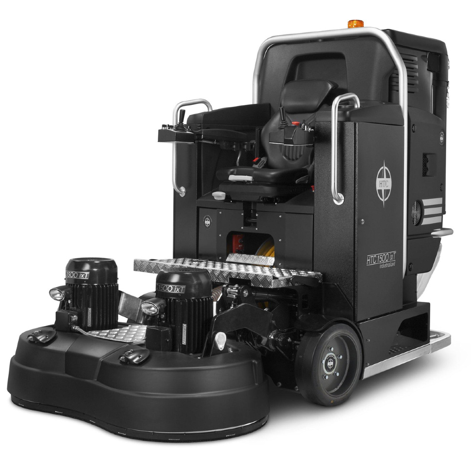 Мозаично-шлифовальная машина HTC 1500 ixT - самоходная шлифовальная машина с местом для оператора применяется для проведения широкого спектра операций с бетонными и каменными поверхностями. На машине установлены два трехфазных двигателя мощностью по 11 кВт каждый. Ширина шлифовки составляет 1450 мм. Отдельный двигатель, питаемый от аккумуляторов, передвигает машину при погрузке и выгрузке. Машина оборудована системой распыления воды Mist Cooler System и двумя встроенными системами удаления пыли. Совместима с технологией HTC Superfloor. Диаметр используемых дисков (8 шт) - 270 мм. Кол-во используемых шлифовальных элементов (алмазных франкфуртов) - 24 шт. Машина может поворачиваться на 180 градусов на месте. Сиденье оператора, установленное на независимой гидроподвеске, предохраняет оператора от воздействия вредной вибрации. Вес оборудования 1900 кг.