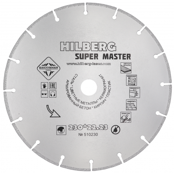 Алмазный диск Hilberg Super Master Ø230 мм применяется для сухой и мокрой резки стали, цветных металлов, керамогранита, мрамора и кирпича. Толщина алмазного слоя 2 мм, а высота 10 мм. Посадочное отверстие - 22,23 мм. Диск произведен по технологии вакуумной пайки. Диск используется на УШМ.