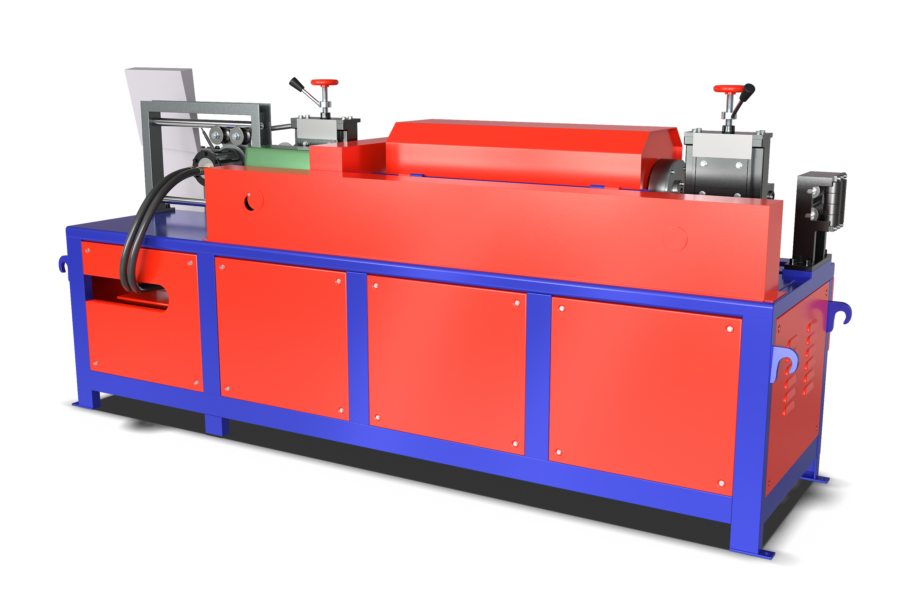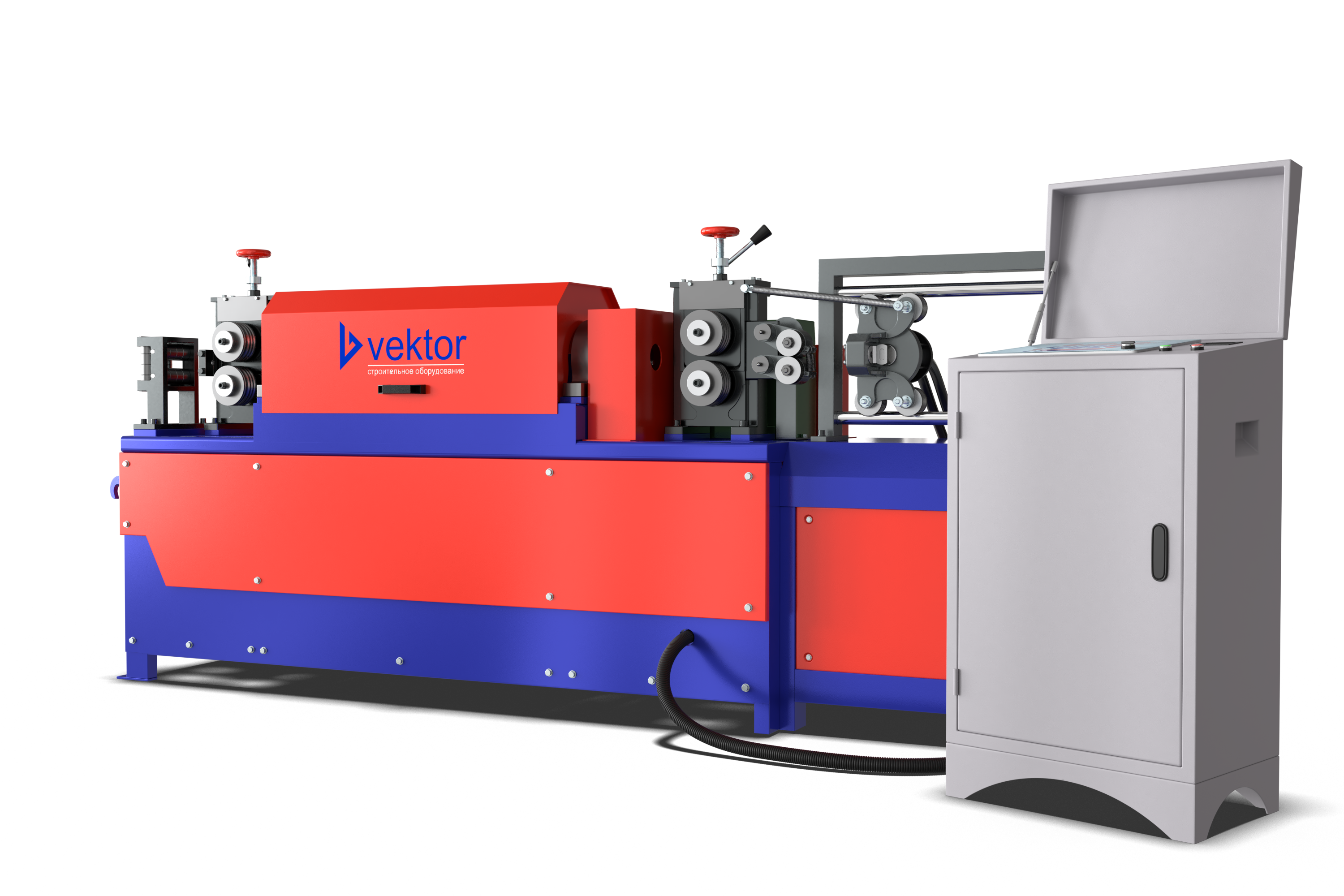 Правильно-отрезной станок Vektor CCM-14 с электронным блоком управления используется для выпрямления и резки прутков диаметром до 14 мм. На станке можно задать нужные параметры: длину реза прутка, количество резов и количество партий. Максимальная скорость протяжки арматуры 80 м/мин. Мощность станка 5,5 кВт. Принцип работы: двигатель через шкив и ремни передает вращение на выпрямляющую раму, которая выполняет функции подачи и выпрямления арматуры. Выпрямление осуществляется за счет давления боковых роликов на арматуру. Нож производит резку при помощи гидропривода, давление в гидроприводе создается масляным насосом. Вес оборудования 860 кг.