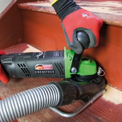 Шлифовально-фрезеровочная машинка Eibenstock EOF 100 мощностью 1400 Вт применяется для снятия тонкого слоя краски, лака, грязи или другого покрытия с деревянной или минеральной поверхности. Глубина фрезерования составляет от 0,1 мм до 1,0 мм. Используемый диаметр диска 100 мм. Мягкая прорезиненная ручка обеспечивает подавление вибрации и отсутствие скольжения при обхвате рукой. Возможно подключение промышленного пылесоса к 35-мм насадке для высокой мощности всасывания и улавливания пыли во время работы. Машина оборудована плавным пуском, контролем температуры и защитой от перегрузки по току. Вес оборудования 3,1 кг.