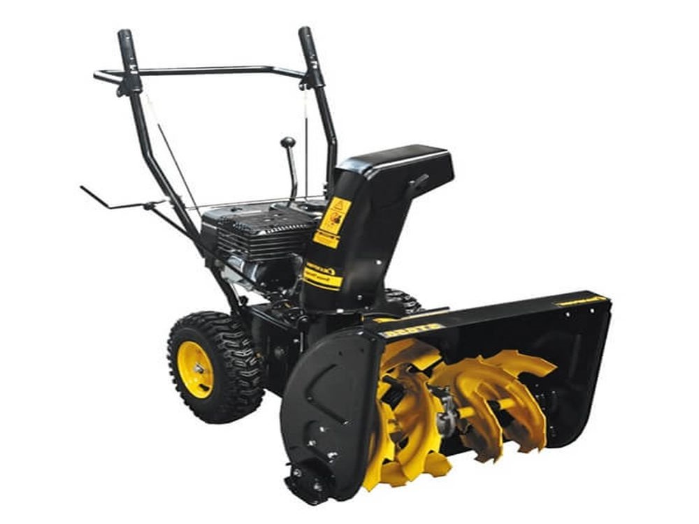 Снегоуборщик CHAMPION ST656 - самоходная модель с ручным запуском двигателя. Снегоуборщик с двухступенчатой системой выброса снега оборудован бензиновым двигателем G200HK CHAMPION мощностью 6,5 л.с. Объем топливного бака 3,6 л. Рабочая ширина захвата составляет 560 мм. Высота забора снега - 510 мм. Диаметр колес 330 мм. 5 скоростей вперед и 2 назад позволяют выбрать оптимальный режим работы. Эргономичная рукоятка снегоуборщика снижает напряжение в руках пользователя, для удобства транспортировки ее можно сложить. Угол выброса снега регулируется вручную, а положение желоба настраивается при помощи специального рычага или дистанционно. Шнек изготовлен из качественной стали. Вес оборудования 87 кг.