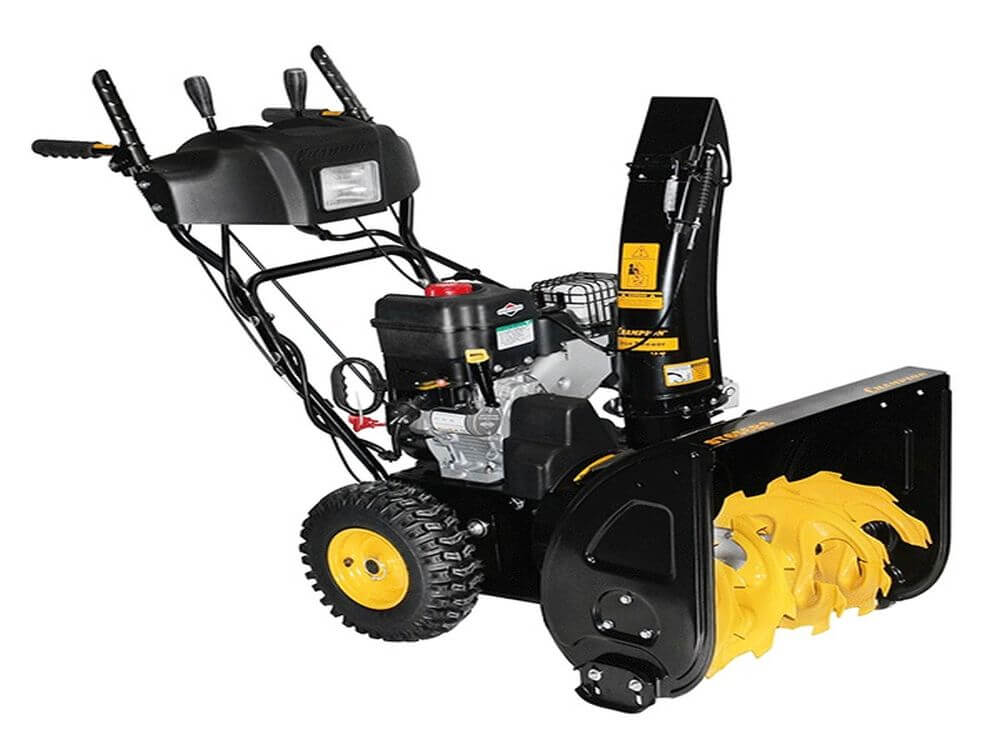 Снегоуборщик CHAMPION ST656BS с двухступенчатой системой выброса снега оснащен бензиновым двигателем Briggs&Stratton Snow 950/13D137 мощностью 6,5 л.с. Объем топливного бака 3 л. Рабочая ширина захвата составляет 560 мм. Высота забора снега - 510 мм. Диаметр колес 330 мм. 6 скоростей вперед и 2 назад позволяют выбрать оптимальный режим работы. Эргономичная рукоятка снегоуборочной машины снижает напряжение в руках пользователя, для удобства транспортировки ее можно сложить. Угол выброса снега и положение желоба регулируется как вручную, с помощью троса, так и дистанционно. Шнек изготовлен из качественной стали. Вес оборудования 77,5 кг.
