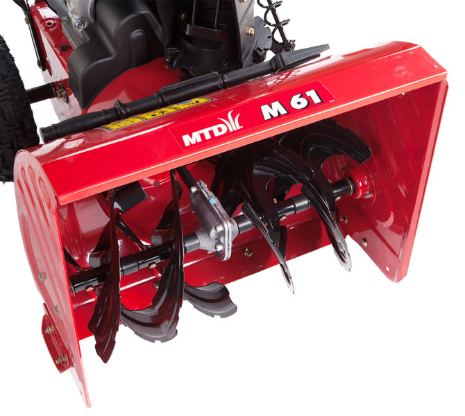 - Двухступенчатая система уборки снега MTD M 61 - снег подается под кожух шнеком и затем выбрасывается крыльчаткой через раструб
