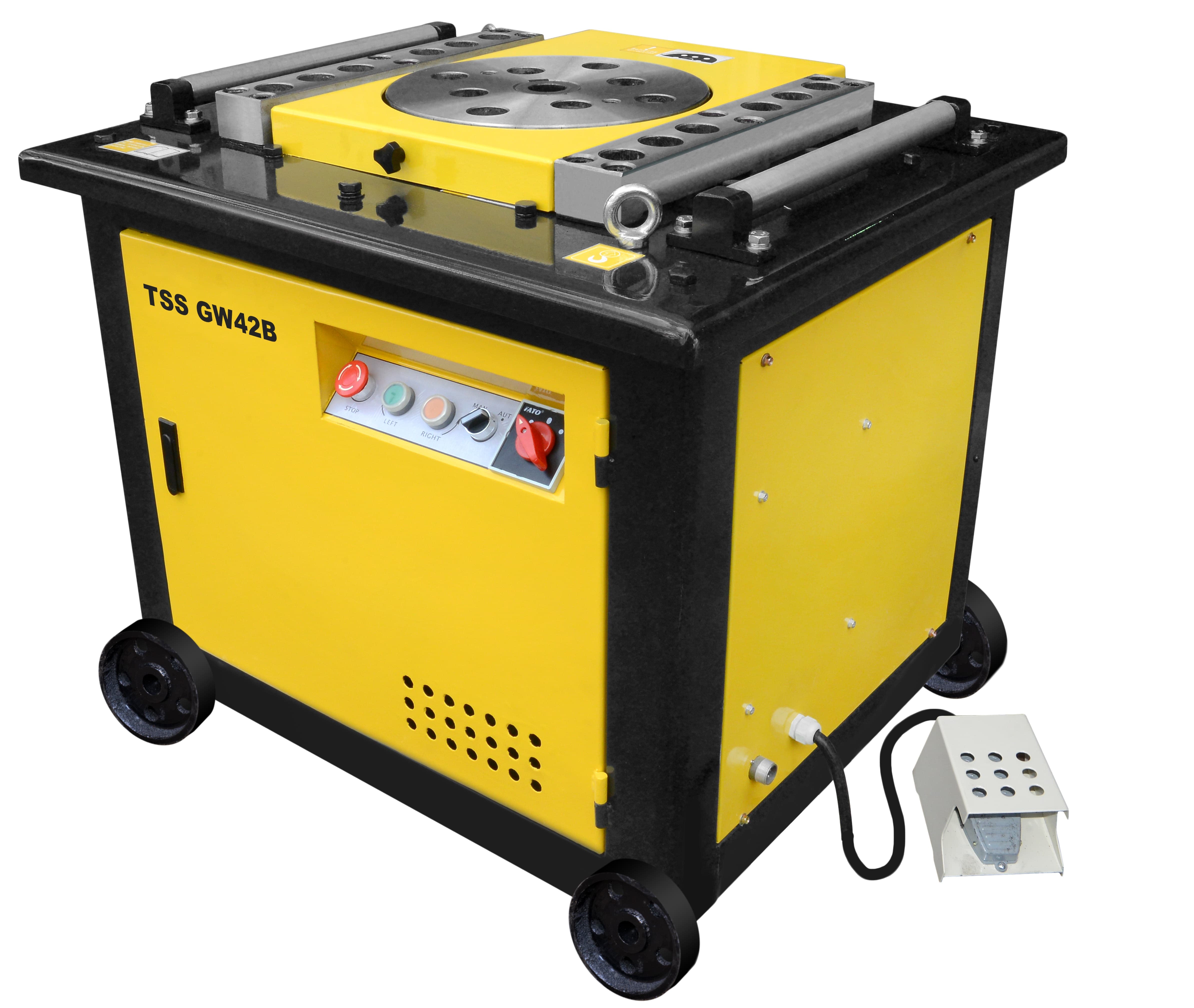Станок для гибки арматуры TSS GW 42B применяется для холодной гибки арматурной стали. Наличие педального и ручного управления способствует удобству работы оператора. Диск сгибания работает в режиме доводчика. Станок используется на строительных площадках, производствах железобетонных и металлических конструкций и в производственных цехах. Станок оснащен электрическим двигателем 380В мощностью 3 кВт. Концевой выключатель отвечает за смену направления вращения рабочего стола при достижении заданного угла гибки. Максимально допустимый диаметр сгибаемой арматуры 38 мм. Все детали станка хорошо закреплены и защищены. Вес оборудования 320 кг.