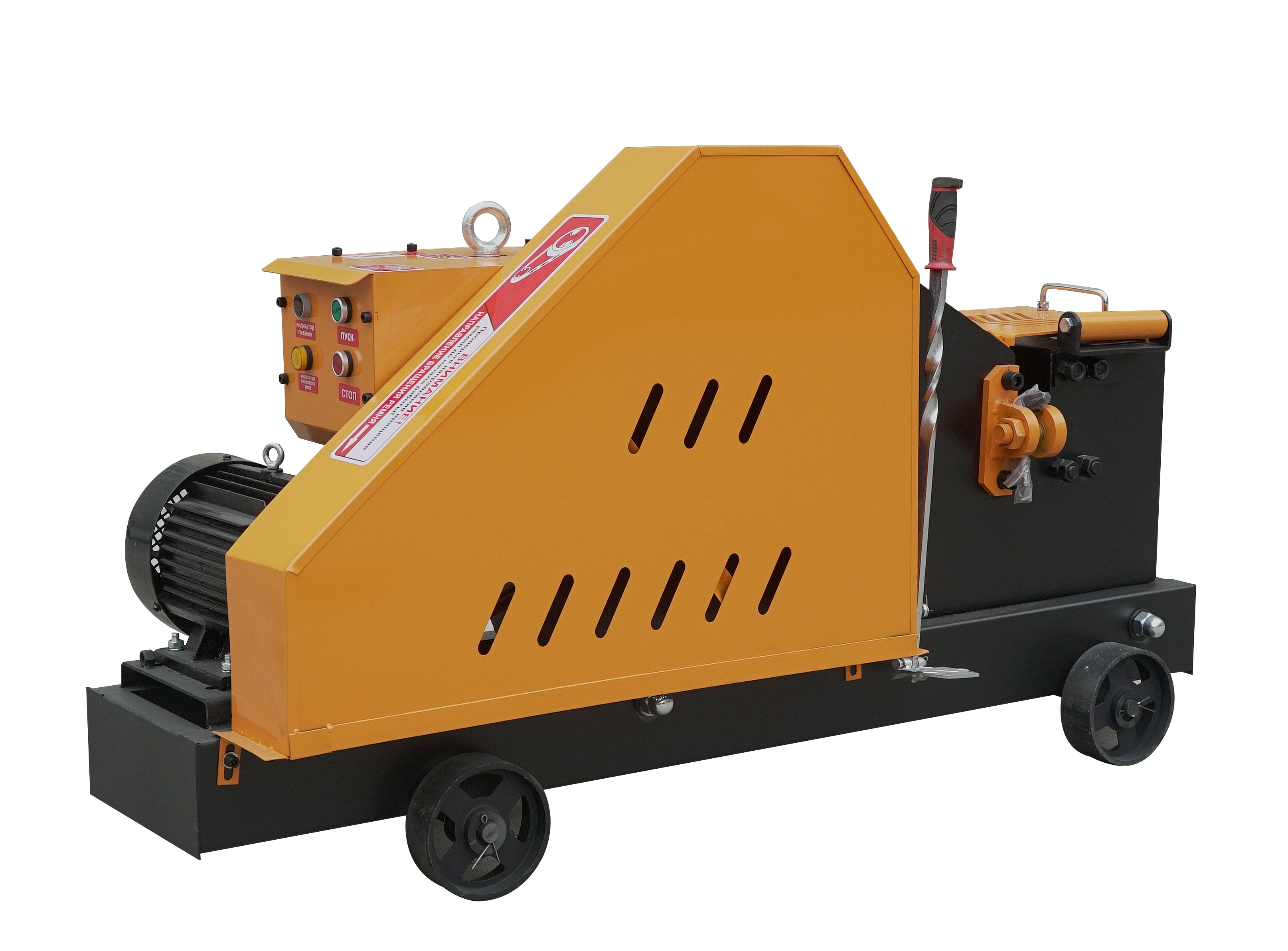 - Станок оснащен защитной крышкой отрезного участка и регулируемым упором для арматуры.
