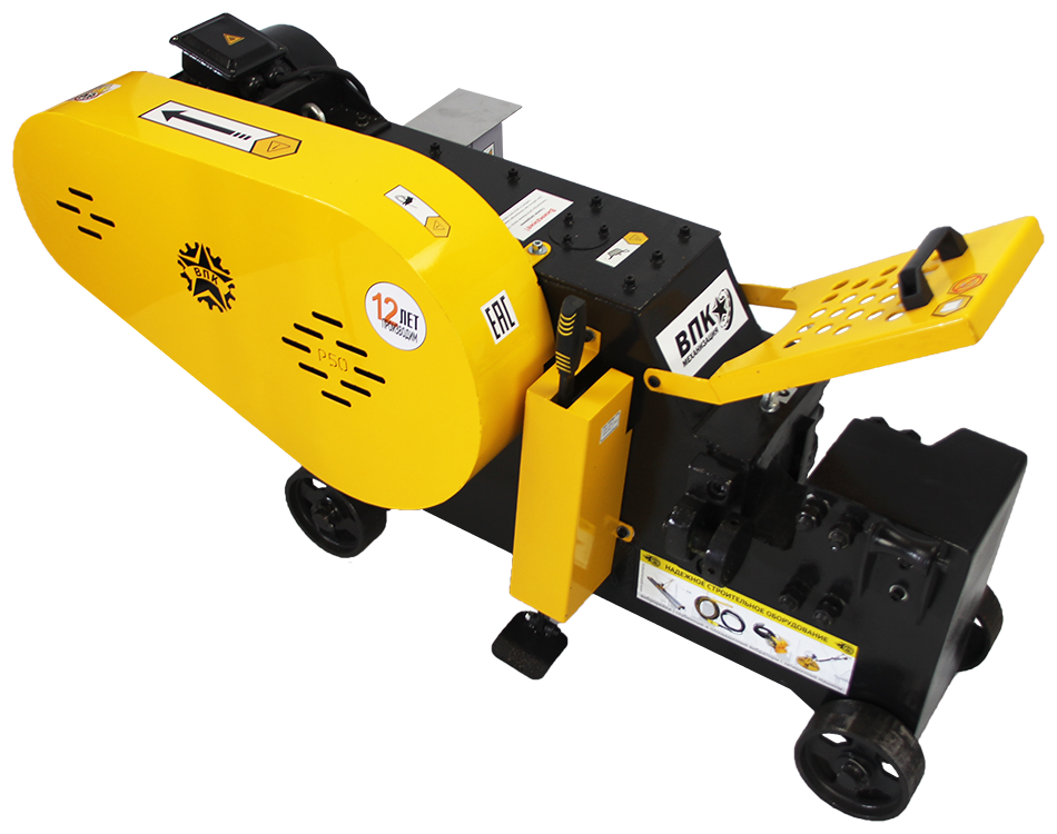 Станок для резки арматуры ВПК Р-52 используется при производстве железобетонных конструкций, нарезки прутков требуемой длины из арматурной и обычной углеродной стали и стали с винтовой нарезкой. Мощность станка 4 кВт. Максимальный диаметр разрезаемой арматуры 52 мм. Ручное и педальное управление обеспечивают удобство работы для оператора, Станок оснащен колесам и специальными рым-болтами для зацепа крюком подъемного крана. На станке есть возможность одновременной резки 2-х и 3-х стержней арматур. Срок службы комплекта ножей при непрерывном использовании — более 45 рабочих смен. На станке установлена система защиты электродвигателя УЗО. Станок соответствует техническому регламенту Таможенного союза (декларация ЕАС). Вес оборудования 562 кг.