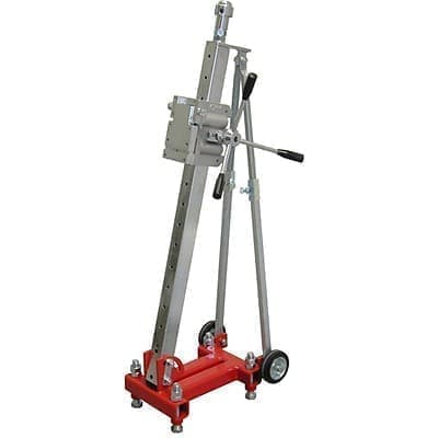Надежная, крепкая станина для установки двигателей алмазного сверления с максимальным диаметром бурения до 500 мм. Благодаря быстросъемному креплению "ласточкин хвост", двигатель легко устанавливать на стойку. Основание станины сварено из стального профиля и имеет 4 регулировочных болта и транспортировочные колеса. Колонна из стали выдерживает увеличенную нагрузку. Каретка передвигается с помощью механизма "шестерня-рейка", зубчатая рейка выполнена из стали. Возможность сверлить под углом от 0 до 60°, задние упоры увеличивают жесткость станины.
