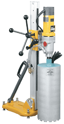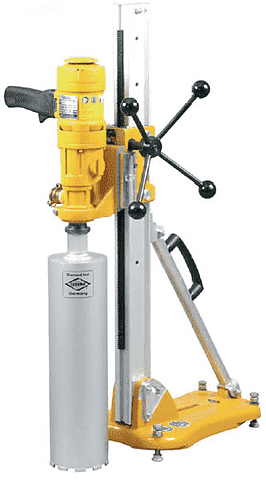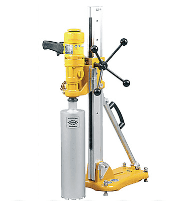 Установка алмазного бурения Cedima H-250 сверлит отверстия в бетоне и железобетоне диаметром до 450 мм, также доступно сверление до 500 мм в абразвиных материалах. Вместе с установкой поставляется опорная стойка H-250 с алюминиевой подножкой, с максимальных ходом каретки 650 мм и возможностью наклона до 45°.Высокопрочная опорная стойка имеет крепление с помощью дюбелей или вакуума. Сверлильный мотор крепится к стойке посредством пластин крепления типа B и C. Мощность установки составляет от 2 до 3,3 кВт.