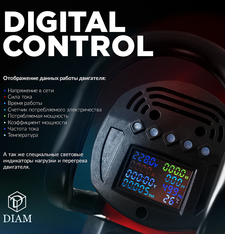 - Функция DIGITAL CONTROL. Цифровой дисплей отображающий данные работы двигателя, такие как напряжение в сети, сила тока, потребляемая мощность в моменте, коэффициент мощности, частота тока, температура, счетчик потребляемого электричества, время работы.