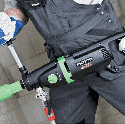 Установка алмазного бурения Eibenstock DBE 162 сверлит отверстия диаметром до 162 мм в железобетоне, кирпиче, натуральном камне и асфальте с использованием воды. В режиме сухого сверления установка применяется для сверления отверстий в силикатном кирпиче, кирпичной кладке, клинкерном кирпиче диаметром до 202 мм, в бетоне до 162 мм. Мощность установки 2,2 кВт. Трехскоростной редуктор обеспечивает оптимальную скорость для сверления отверстий различных диаметров. Тип крепления может быть анкерным или вакуумным при заказе дополнительного комплекта. Алмазная установка оснащена плавным пуском, температурным контролем и защитой от перегрузок по току, визуальной индикацией перегрузки и постоянной скоростью. Колонна установки может быть настроена на 45˚.