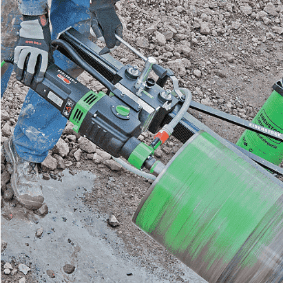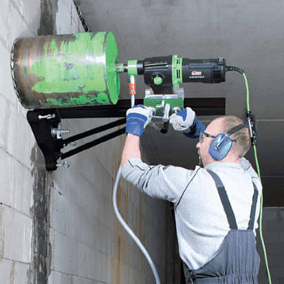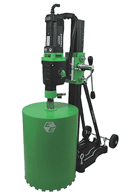 Установка алмазного бурения Eibenstock DBE 352 сверлит отверстия в железобетоне, кирпиче, натуральном камне и асфальте диаметром до 352 мм. Тип крепления может быть анкерным или вакуумным, при наличии специального комплекта. Мощность установки 3 кВт. Трехскоростной редуктор обеспечивает оптимальный крутящий момент для сверления отверстия различного диаметра. Высокие эксплуатационные характеристики обеспечиваются алюминиевым корпусом, кабелем в оболочке из полиуретана и редуктором в масляной ванне. Доступно сверление под углом до 45˚.