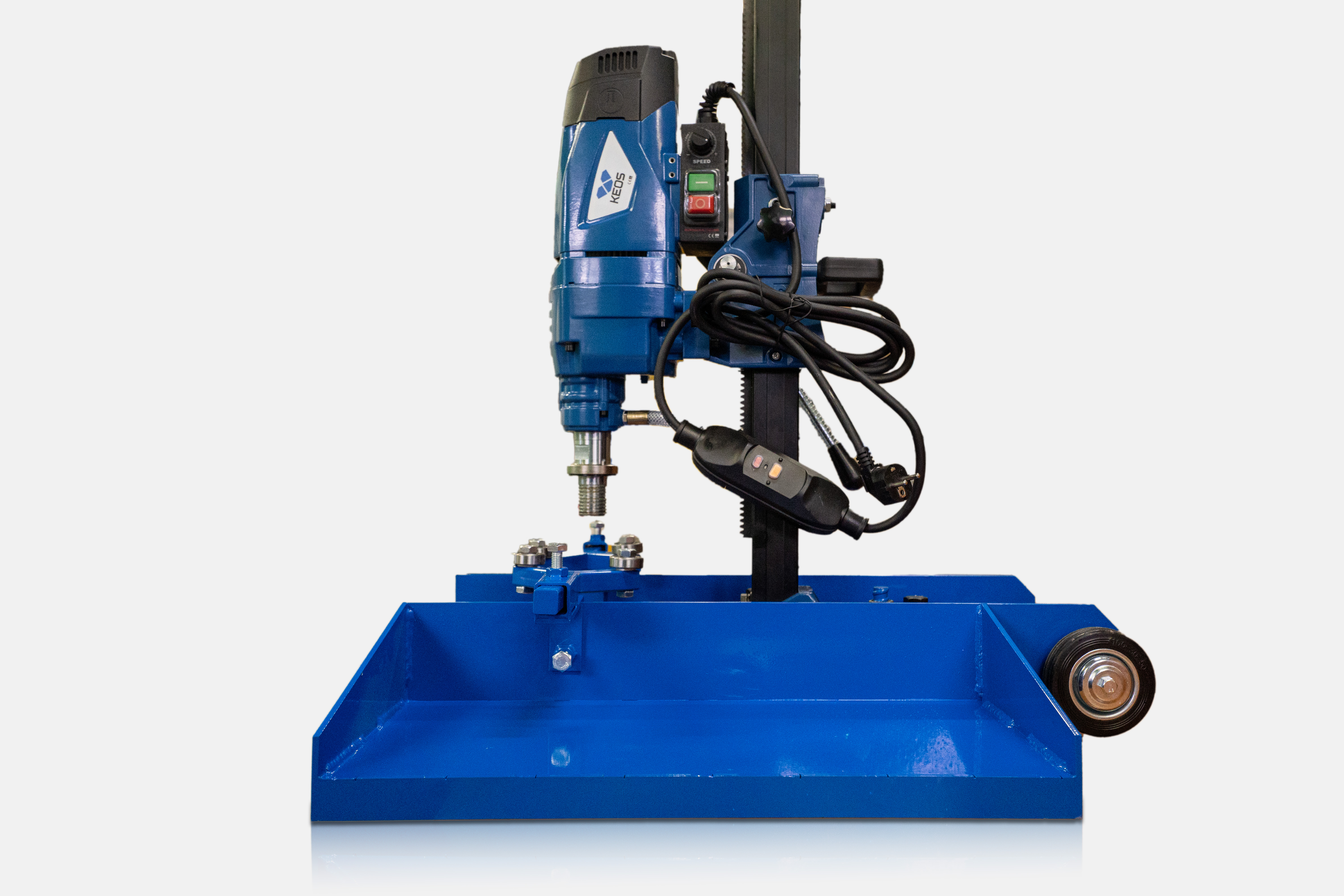 Керноотборник KEOS KB-200 (250) в базовой комплектации состоит из мотора KS-250 мощностью 2,8кВт, прямого штатива и опорной плиты. Также штатив можно укомплектовать мотором KEOS KS-180P. Применяется для отбора кернов в асфальте (редко: в бетоне и железобетоне) специализированными алмазными коронками. Максимальный диаметр сверления 250 мм. К станине крепится опорная плита, обеспечивающая дополнительную устойчивость. Операторы становятся на платформы, удерживая своим весом станину с мотором в неподвижном положении даже при высокой нагрузке. Электронная регулировка оборотов позволяет контролировать скорость вращения алмазной коронки. Вес оборудования 45 кг.