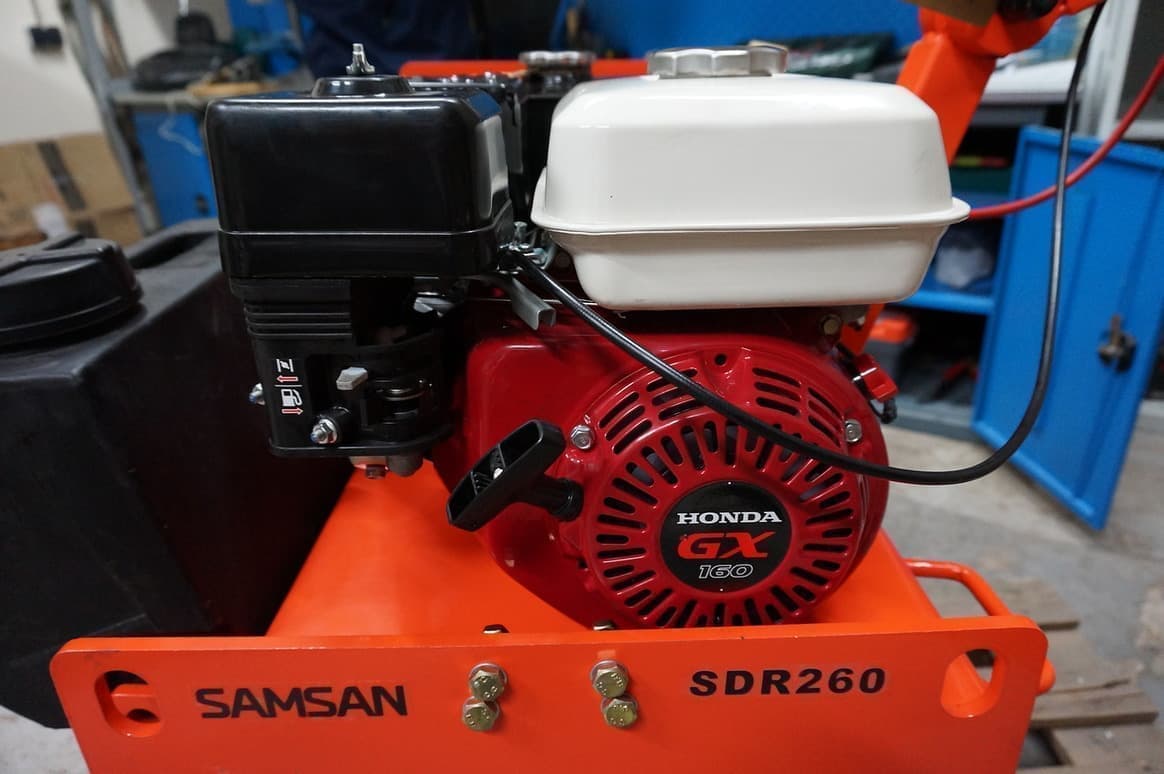Ручной одновальцовый виброкаток SAMSAN SDR 260 оборудован бензиновым двигателем Honda GX 160, мощностью 5,5 л.с. Небольшие размеры машины позволяют эксплуатировать ее в труднодоступных и узких местах. Используется для уплотнения различных материалов: песка, грунта и асфальтобетонных смесей. Ширина обработки составляет 560 мм. Низкий уровень шума позволяет комфортно работать в общественных местах.