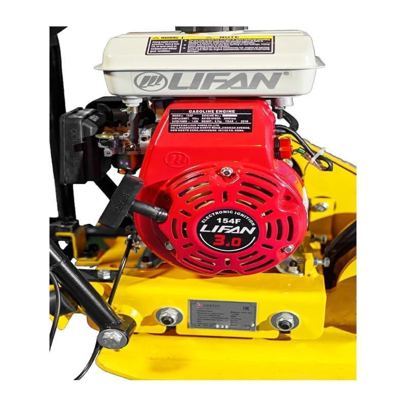 Виброплита Vektor VPG-50B оборудована бензиновым двигателем Lifan 154F мощностью 3 л.с. Применяется для уплотнения грунта, щебня и песка на небольших по объему участках. За счет маленького веса 50 кг и компактных габаритов 540x320x490, плита проста в управлении и транспортировке. Чугунное основание и защитная рама обеспечивают сохранность двигателя и защищают виброплиту от случайных повреждений, а рукоятка с резиновым чехлом снижает вибрацию. Машина оснащена утолщенной подошвой 8 мм и разборным редуктором.