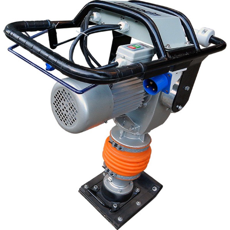 Трамбовка оснащена электрическим двигателем 220В мощностью 3 кВт. Для безопасности, трамбовка имеет автоматическое защитное выключение при отпускании оператором ручки. Функция надежна, так как использует магнитный бесконтактный выключатель и твердотельные реле. Трамбовка незаменима для работы в закрытых или плохо проветриваемых пространствах. Размер подошвы 300х330 мм. Сила удара составляет 13,5 кН. Удобное положение пускового рычага гарантирует комфорт на протяжении долгого времени эксплуатации. Все электросоединения выполнены в виде надёжных разъемов с фиксаторами.