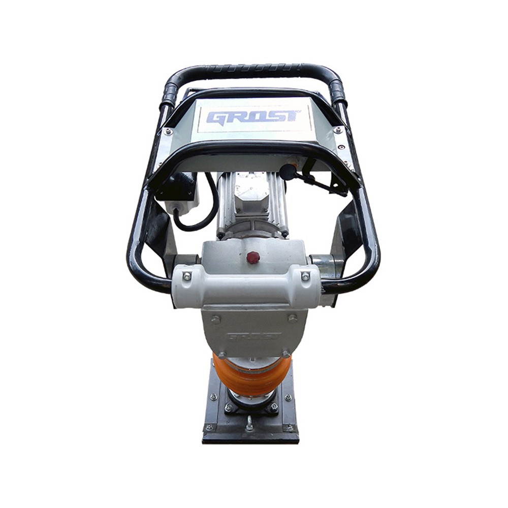 Вибротрамбовка GROST TR90Е1 применяется для быстрого и качественного уплотнения грунта в канавах для прокладки труб, возле бордюров или опорных сваи.