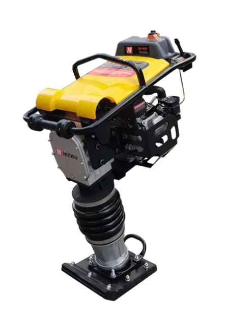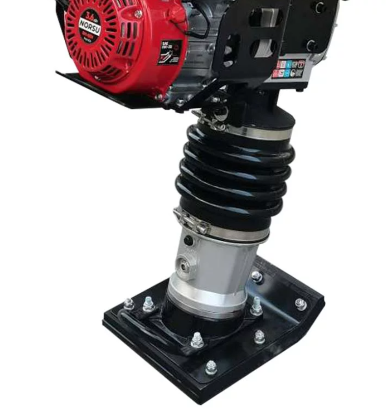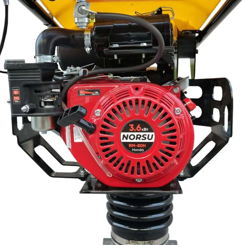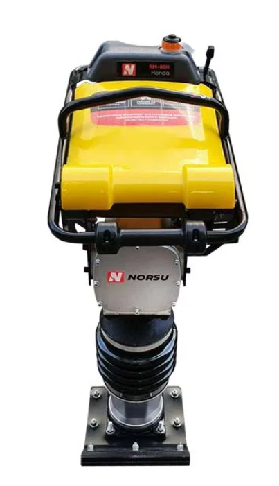 Вибротрамбовка NORSU RK-80H используется для уплотнения грунтов при выполнении дорожных работ, устройстве фундаментов и тротуаров. Трамбовка оборудована бензиновым двигателем NORSU GX160 мощностью 4,8 л.с. Объем топливного бака 2.8 л. Максимальная глубина уплотнения 120 мм. Небольшие габариты позволяют использовать вибротрамбовку в условиях ограниченного пространства: траншеи, края тротуаров, участки вокруг люков. Материал корпуса выполнен из алюминия. Сила вибрации 10 кН. Вес оборудования 80 кг.