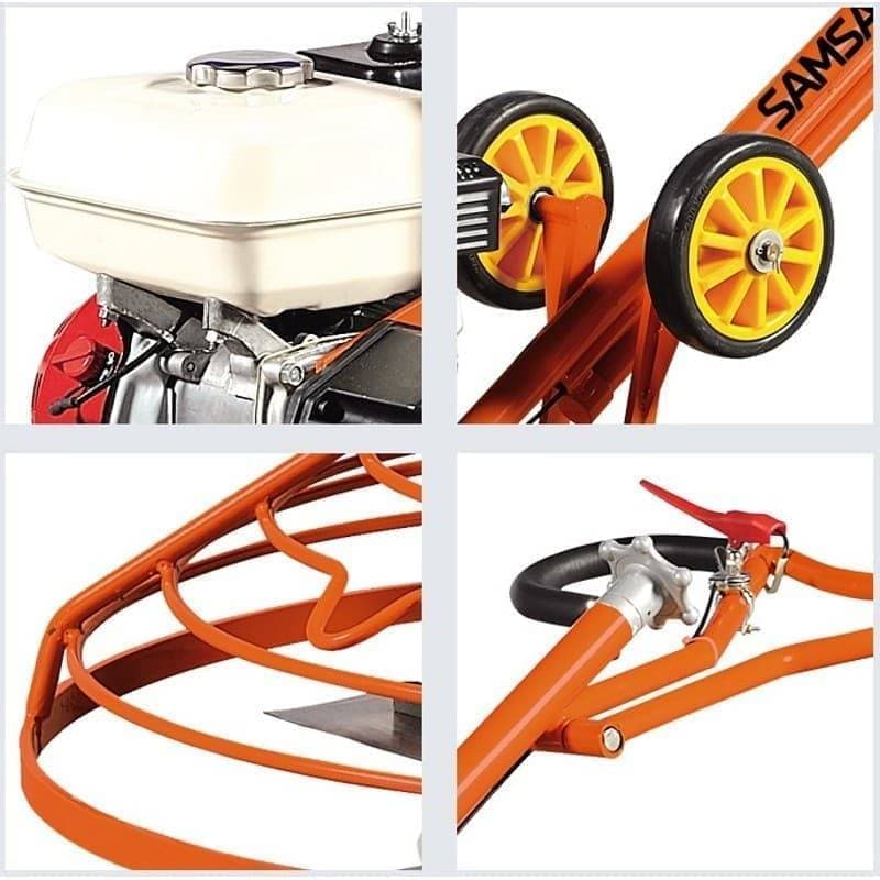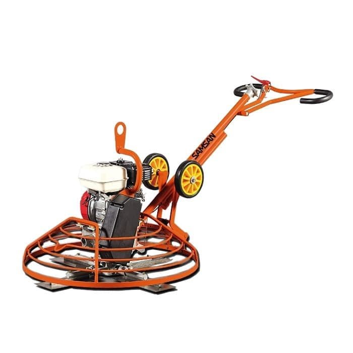 Затирочная машина Samsan WPT 362 WPT 362 оснащенная бензиновым двигателем Loncin мощностью 9 л.с, используется для заглаживания цементно-бетонных смесей на небольших площадях. Диаметр обработки составляет 900 мм. Машина может работать вплотную к стенам, защитное крутящееся колесо убережет боковые поверхности от повреждений. Угол наклона лопастей легко контролируется благодаря регулируемому винту. В случае потери контроля управления оператором, автоматический выключатель отключит двигатель.